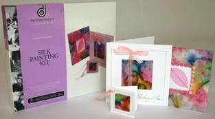 A piece of silk, 3 pots of silk paint,1 pre cut frame and white backing card, 1
