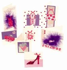 8 pre-cut & folded cards, purple paper, iridescent paper, glue, ribbon,
